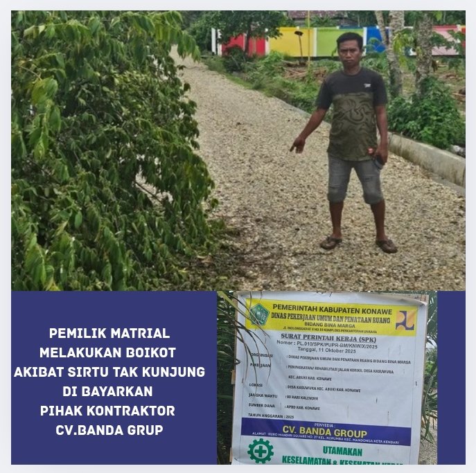 Pasalnya, material tasirtu dalam proyek rehabilitasi jalan yang melekat di Dinas Pekerjaan Umum dan Penataan Ruang dengan anggaran senilai Rp 187.500.000 yang dikerjakan CV Banda Group belumlah dilunasi meski pekerjaan telah selesai dikerjakan.
