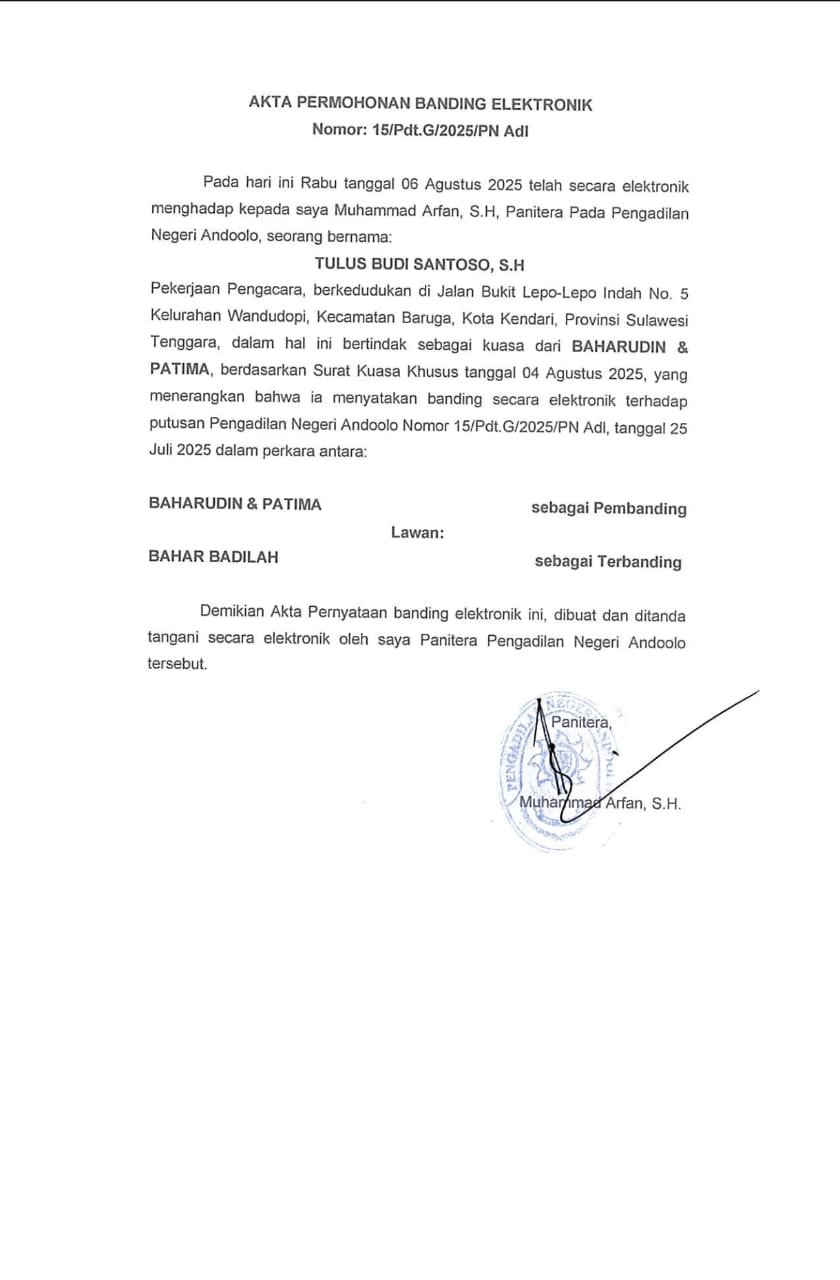 Sarpin menjelaskan bahwa pihaknya telah mengambil langkah hukum lebih lanjut dengan mengajukan permohonan banding ke Pengadilan Tinggi Sulawesi Tenggara. Surat permohonan banding tersebut telah didaftarkan sejak tanggal 6 Agustus 2025.