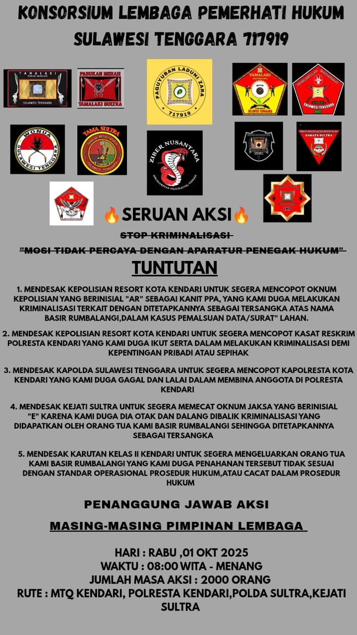 ”Dengan itu sekali lagi secara tegas saya sampaikan -+ 2000 massa aksi bahkan bisa lebih dari itu akan hadir di kota Kendari.”Ungkapnya.
