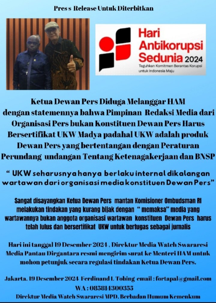 Jakarta,Bilal_investigasi.co.id– Pada momen peringatan Hari Antikorupsi Sedunia 2024 yang bertema “Teguhkan Komitmen Berantas Korupsi untuk Indonesia Maju,” sorotan tajam justru mengarah kepada Ketua Dewan Pers. Ketua Dewan Pers dituduh melanggar Hak Asasi Manusia (HAM) terkait pernyataannya bahwa pimpinan redaksi media dari organisasi pers non-konstituen Dewan Pers wajib memiliki sertifikat Uji Kompetensi Wartawan (UKW) Madya.