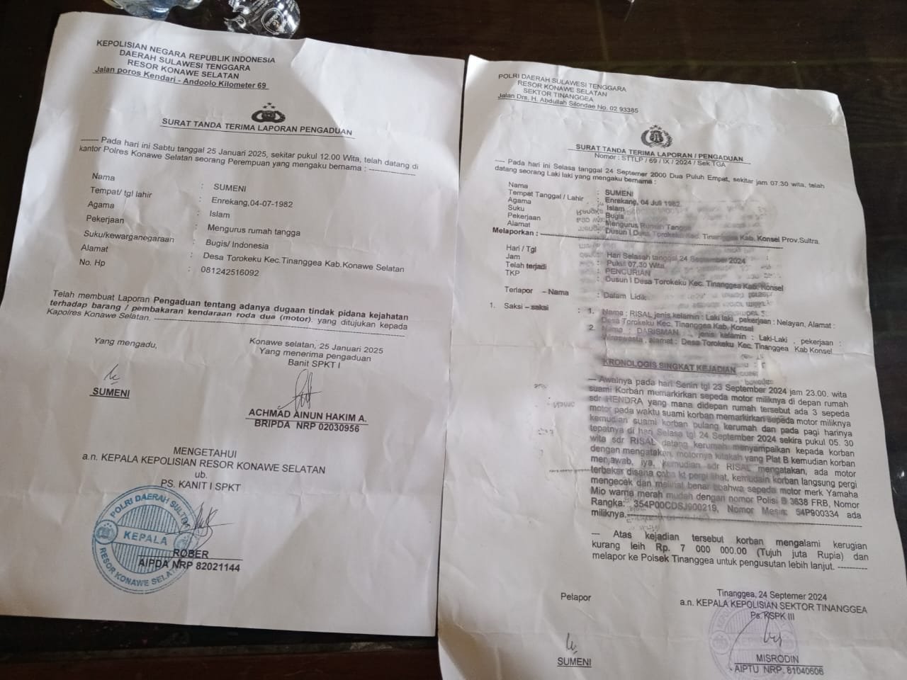 Laporan pertama ibu Sumeni, dipolsek tinanggea, dibuatkan surat pengaduan polisi nomor : STTLP /69/1X/2024/SEK TGA.
