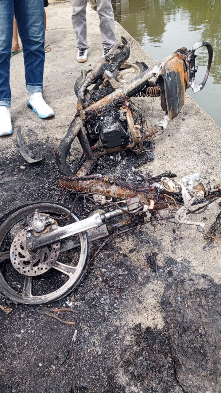 telah terjadi kasus pembakaran kendaraan. oleh orang yang tidak di kenal (OTK) sepeda motor kendaraan roda dua Yamaha Mio nopol B 3638 FRB